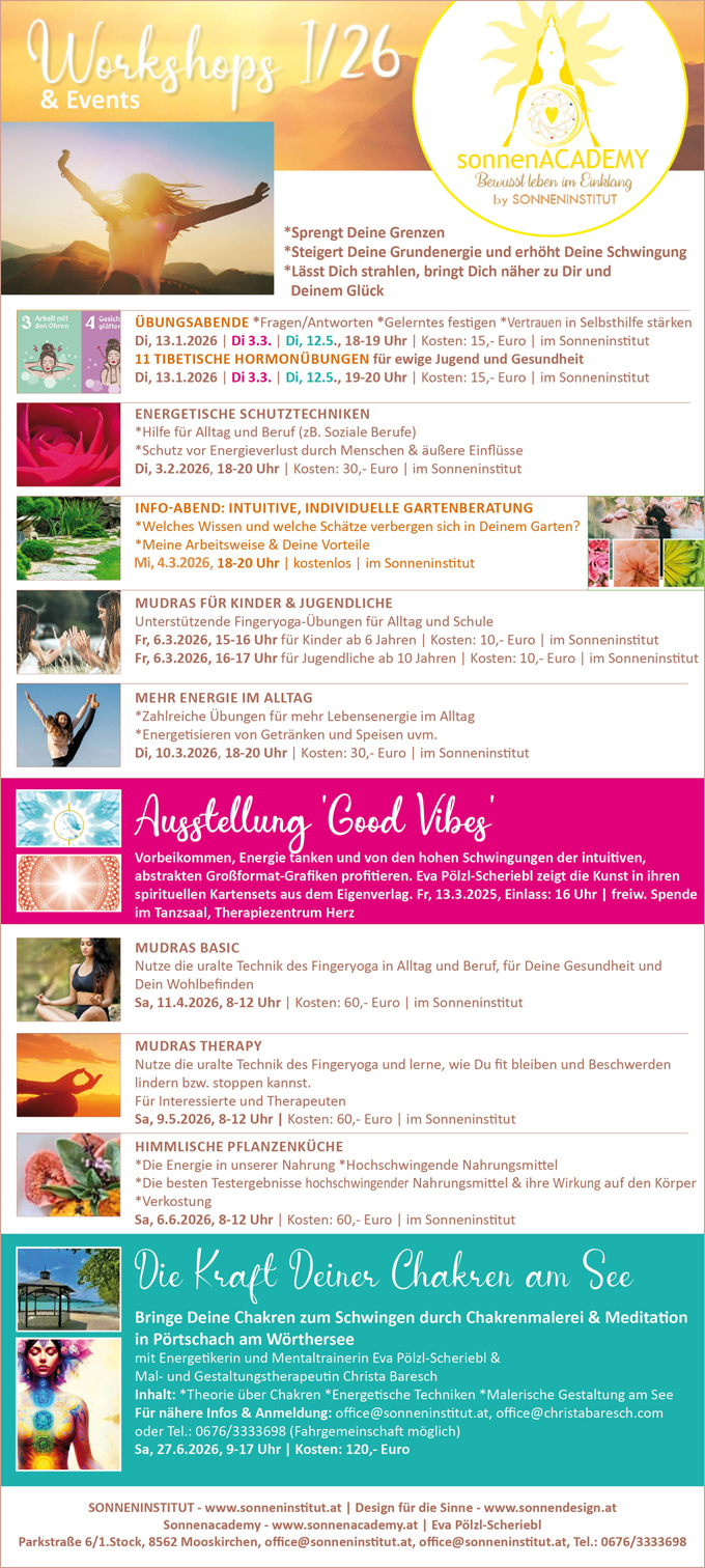 Hier finden Sie Produkte aus dem Eigenverlag, sowie Infos über Beratungen und Behandlungen als auch ein umfangreiches Angebot an Workshops aus der Sonnenacademy. Viel Spaß beim Stöbern! Alles Liebe, Eva Pölzl-Scheriebl